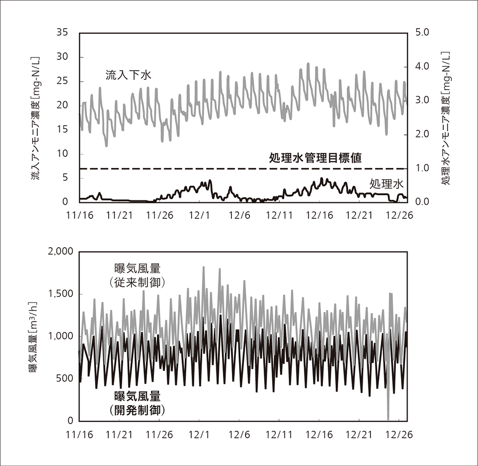 開発制御システムを適用した系列では,流入変動がある中,処理水アンモニア濃度を目標値以下に維持しつつ,従来制御に比べて曝気風量を低減した。