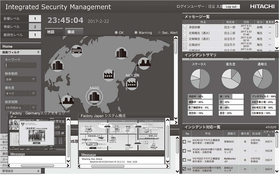 日立は,多種多様なセキュリティの実証環境を構築・保有している。IT系においては,日立グループ約30万人の社内ユーザーに対するITインフラの運用実績を持っている。また,1998年に日本国内で他社に先駆けて組織内CSIRT[Computer Security Incident Response Team(HIRT:Hitachi Incident Response Team)]を発足し,実績を蓄積している。