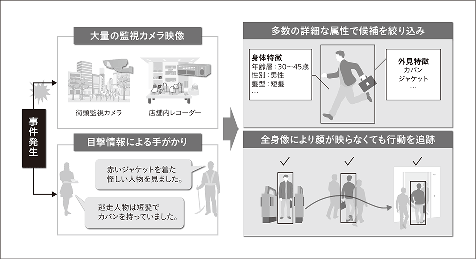 事件発生時,これまでは目撃情報を手がかりに大量の映像を目視で確認する必要があった。本技術では,多数の属性による候補の絞り込みと全身像によるカメラ間追跡により,特定人物の足取りを迅速に把握することができる。