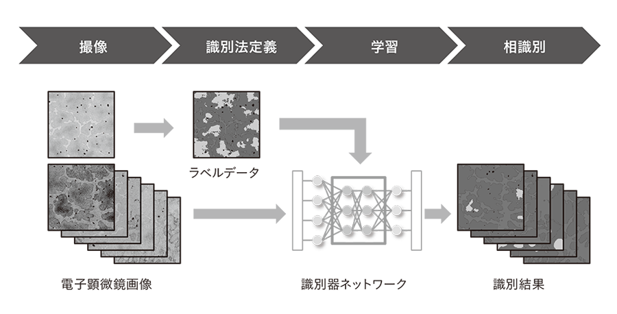 図5に相識別のフローを示す。取得された画像の一部に対して,ユーザーが正しい相の識別方法を定義する。本サンプルの例では,ピクセルごとにα相,γ相またはデンドライトのいずれに識別するべきかを指定したラベルデータを作成する。元のBSE像とラベルデータを対となる学習データとしてネットワークに読み込ませ,学習モデルを作成する。これを用いることにより,多くの画像を自動的かつ定量的に識別する。