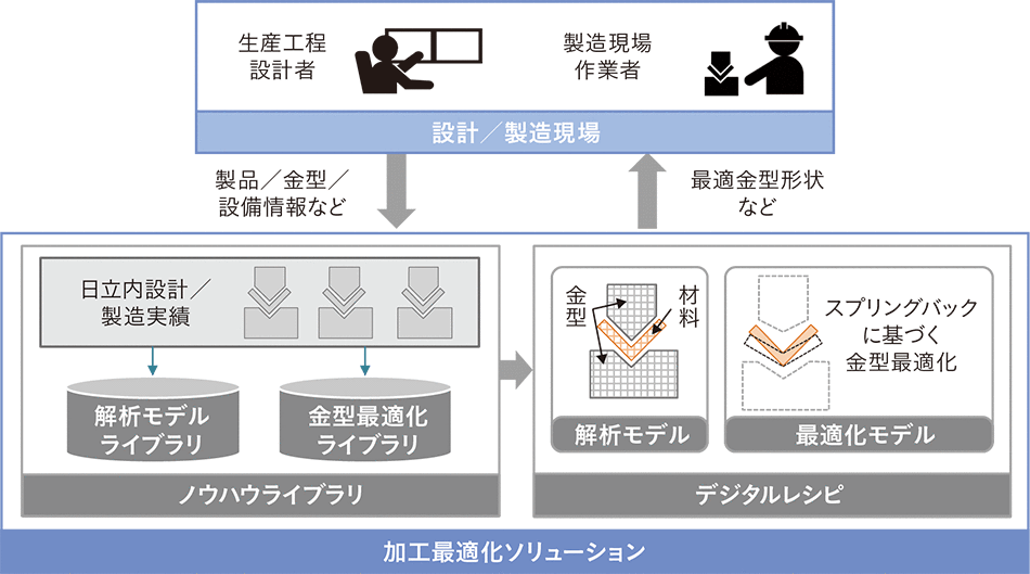 日立は,これまでの解析・最適化モデルの構築実績から機能や設定のパターンを抽出してノウハウをライブラリ化し,それらを組み合わせて適切なモデルを構築することで,金型設計で問題となるスプリングバックを高精度に予測し,金型形状を最適化するプレス成形のデジタルレシピを開発した。このデジタルレシピを活用し,顧客の製品,金型,設備情報から最適な金型形状を提供することで,金型修正回数低減による金型製造リードタイム短縮という顧客価値を生み出す。