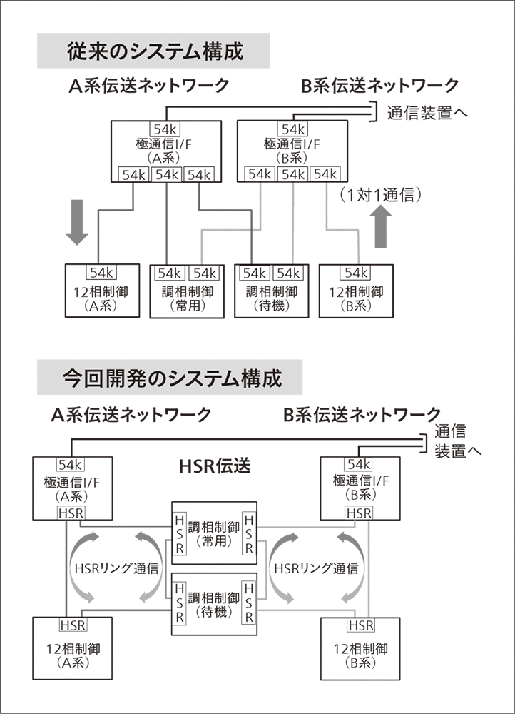 これらの機能を実現するため,交流保護ディジタルリレーで採用しているVeuxbusシリーズを,直流の制御保護装置に初めて適用した。交直変換所には多くの装置が存在するが,従来のサイリック伝送方式(54キロビット/s,光伝送)から産業用イーサネット※)の冗長化通信方式であるHSR(High-availability Seamless Redundancy)伝送方式を適用することにより,装置間インタフェースの大幅な削減と信頼性向上を図った。また,最新の高精度サンプリング技術やリアルタイム通信による技術を応用し,制御保護性能の向上と装置のコンパクト化も実現している(図8参照)。