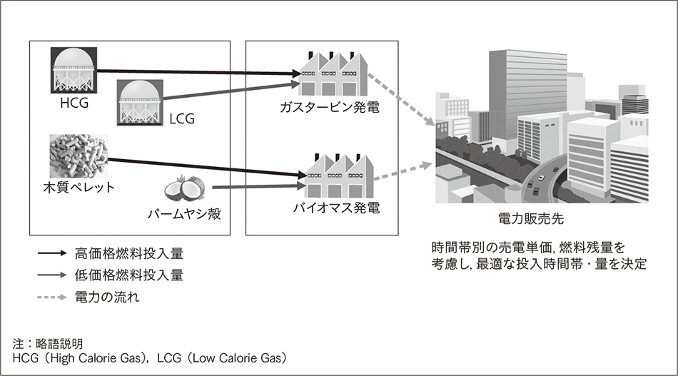 本ソリューションを用いて,燃料供給や発電量の制約の下で売電収益の最大化や燃料消費量が最小となる燃料投入計画の最適解を求めることができる。図4にソリューションの概念を示す。