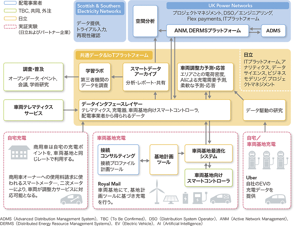 こうした中,日立ヴァンタラをはじめとして日立ヨーロッパ,日立キャピタル株式会社,英国の配電事業者UK Power NetworksおよびScottish & Southern Electricity Networks,ガス・電力大手で家庭用暖房機器などのメンテナンス対応のために多くのサービス車両を保有するCentrica,郵便大手Royal Mail,そして急成長中のライドシェア(相乗り)事業者Uberなど全8社が提携し,電気料金を抑えながらEVの普及と既存の配電網の有効活用をめざす取り組みをロンドンで進めている(図2参照)。