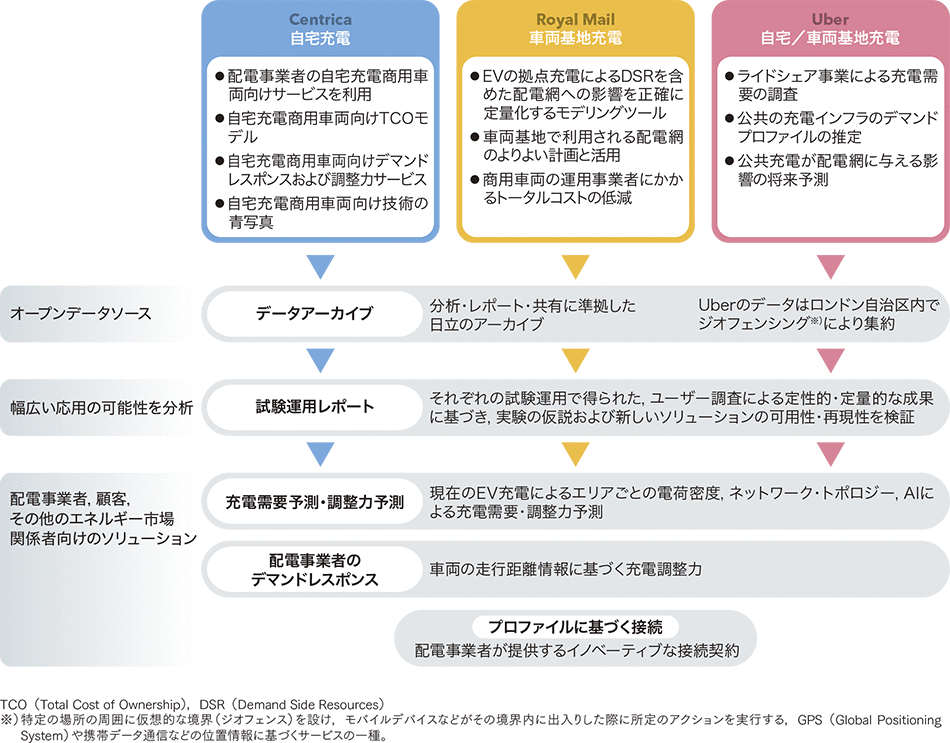 このプラットフォームを通じて,エネルギー専門家がプロジェクトデータを調査することが可能となり,機械学習によって予測・分析モデルが作成される。また配電事業者のシステムと充電パターン,車両の行動のインタフェースとなる機能を付与することで,現在利用可能な調整力を確認することもできる。