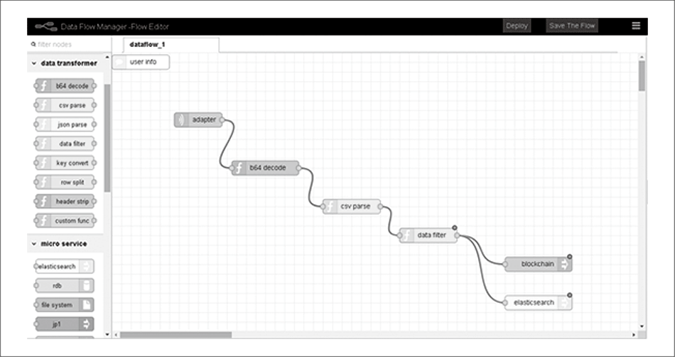 また,データフローをノンプログラミングで設計できることも大きな特長である。従来はデータをどこから収集し,どういう加工を施し,どこに格納するか,といったデータフローの設計にはプログラム作業が必要であるという課題があった。一方,Hitachi Data Hubでは図2に示すデータフローマネージャというツールを用いて課題を解決している。具体的には,データを取り出すためのデータIDを指定し,行う処理に応じてデータフィルタを選び,最後はブロックチェーンに格納するといったフローを,パーツを移動させながらビジュアルに設計することができる。