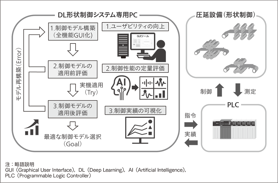 圧延した鋼板の波打ちを制御する形状制御の分野において,品質向上および作業負担の軽減を目的に熟練者の操作方法をデジタル化し,自動制御に反映できるディープラーニングを用いた形状制御システムを提供している。一般的にAIを用いた制御技術には,データから制御モデルを構築することによる調整レス化や,制御モデルを更新するたびに制御性能が向上していくことへの期待がある。しかし,AIがブラックボックスでトライ&エラーが必要になる点や,制御モデルの構築作業が複雑で負担が大きい点などの運用面での問題により,ユーザーによる更新が十分な頻度で行われない課題がある。