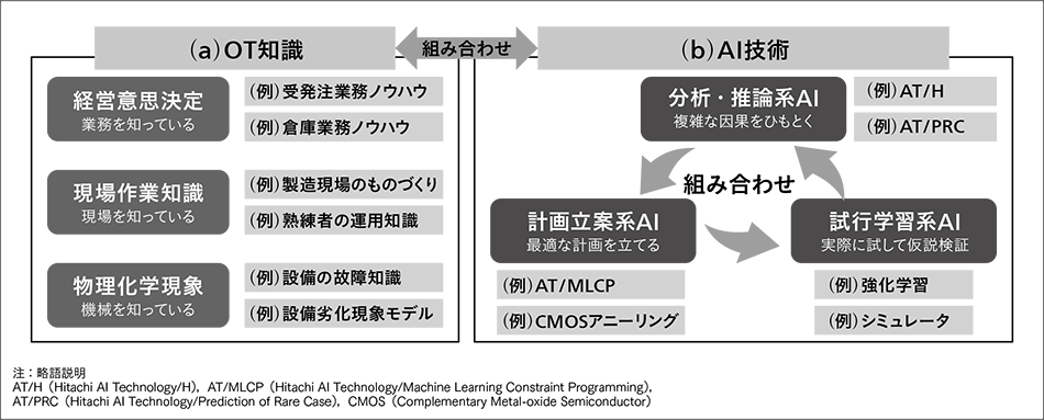 OT知識には,経営に関する知識,現場作業に関する知識,物理化学的な知識などがある。AI技術には,分析や推論をする技術,各種制約に適合する計画を立案する技術,仮説を試行して検証する技術などがある。