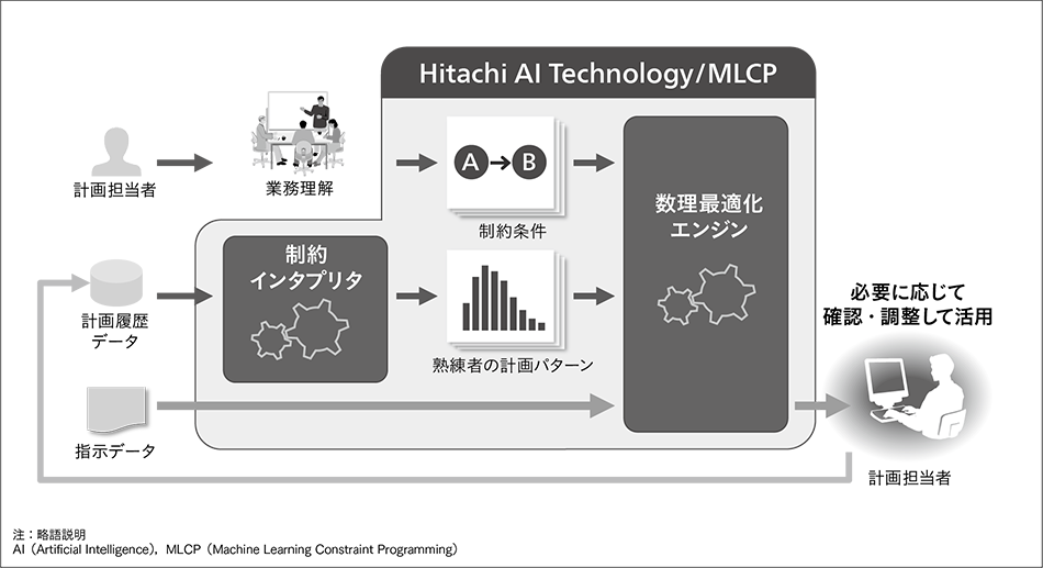 数理最適化技術とAIを連携した日立独自の制約プログラミング技術であり,業務理解の結果や計画履歴データから,最適な計画を立案する。