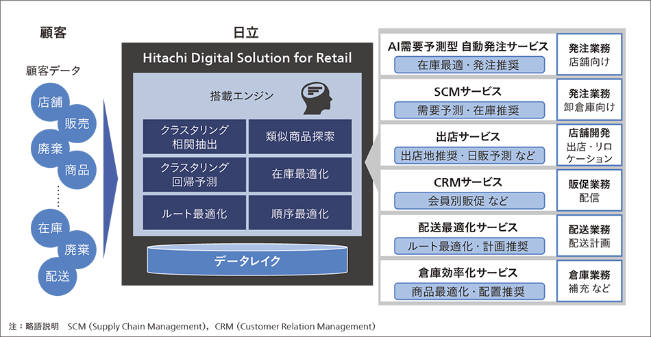 Hitachi Digital Solution for Retailは,顧客データを預かる共通基盤を有し,搭載エンジンを活用することで,「ナレッジ蓄積・データ分析」を肩代わりし,リテールのさまざまな業務に適合するサービスを用意している。