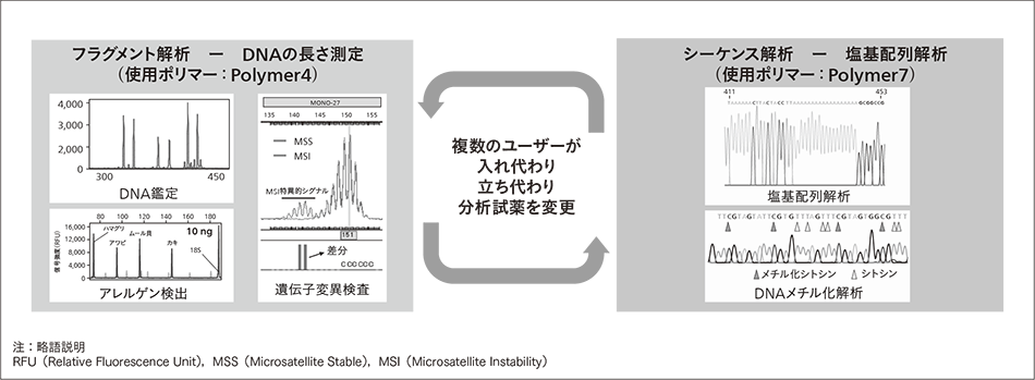 CE(Capillary Electrophoresis)シーケンサーでは分析の目的によって異なる種類のポリマーを使用する。複数のユーザーが,フラグメント解析(DNA鑑定や遺伝子変異検査)と塩基配列分析するシーケンス解析を切り替えて使用する。