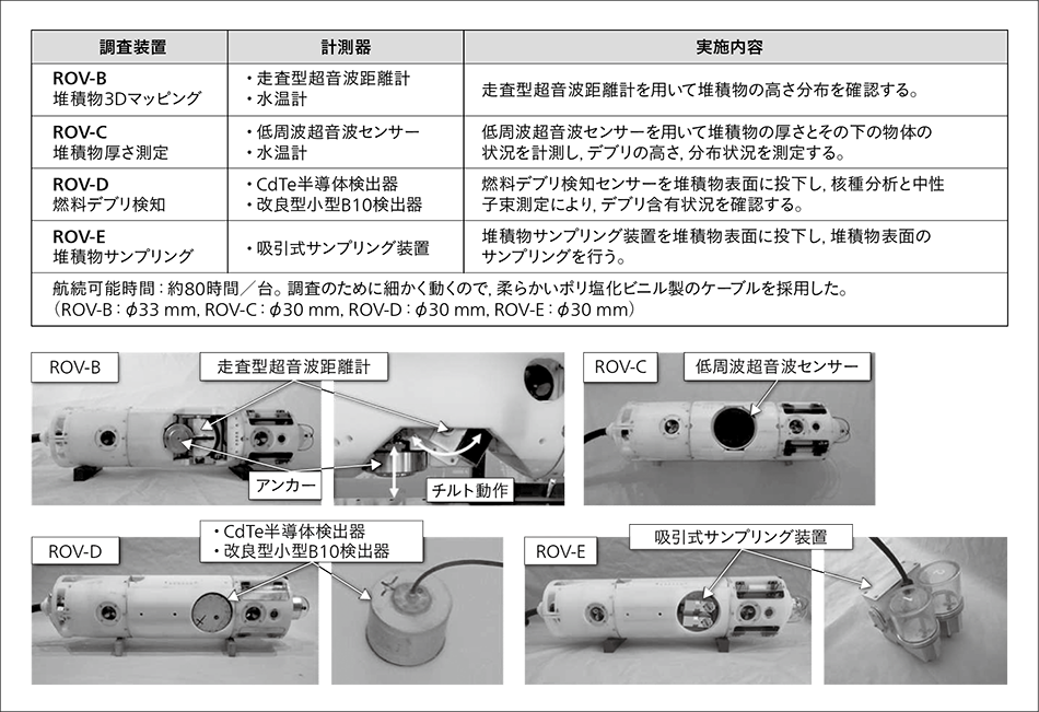 ROV-Dは,燃料デブリ特有の放射線を調査する装置である。10 Gy/hを超える放射線環境であっても核種分析が可能なガンマ線計測と中性子束計測を同時に実現可能な放射線計測器を搭載している。