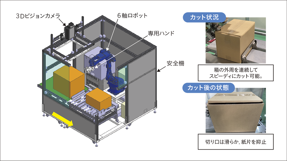 今回開発したロボットシステムは,段ボールの開梱を自動的に実施する装置である。物流現場では,開梱作業をオペレータに頼る場合が多く,単純作業ながらも切創の危険を伴う繰り返し作業である。ロボットシステムは,コア技術である3D(Three Dimensions)ビジョンと画像処理を用いて作業を代替し,正確に段ボールサイズを測定して特殊カッターで天面部を切断する。切り屑を抑え,また中の商品を傷つけない工夫を組み込んでいる。