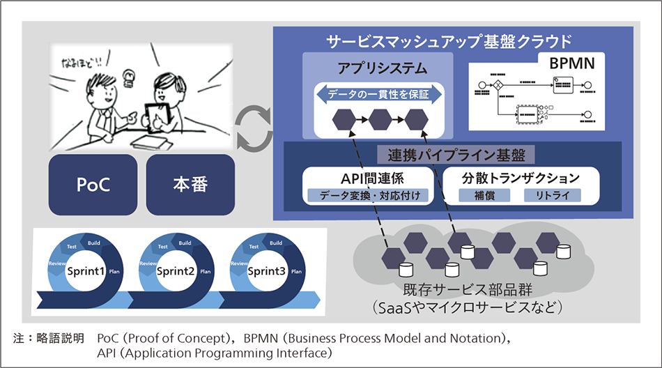 サービスマッシュアップ基盤を用いることで顧客との協創開発を加速でき,要望を持ち帰ることなくその場でシステムイメージを具体化して議論する要件定義や,カスタマーサクセスに向け試行と検証を繰り返して段階的にシステムをアップデートしていく開発運用がより実現しやすくなる。