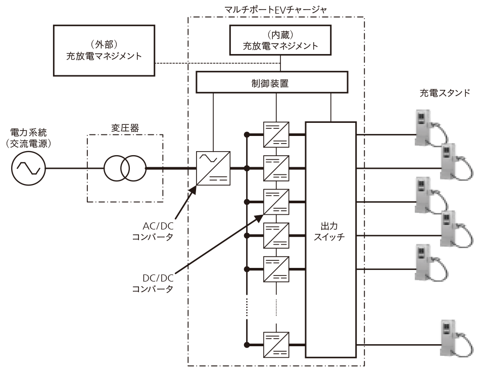 EV(Electric Vehicle)チャージャ本体には,AC/DC(Alternating Current/Direct Current)コンバータ, 絶縁型DC/DCコンバータ などを内蔵している。EV充電容量に応じて,最大20台の充電スタンドを接続することが可能である。