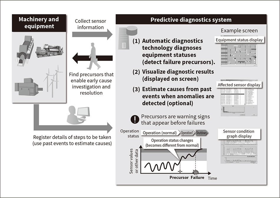 For customers who want to prevent unplanned production equipment shutdowns or who want to pass on experienced operator skills or maintenance expertise, sensors are mounted in machinery and equipment, and the equipment sensor information (operation data) provided by the sensors is collected automatically. Hitachi’s predictive diagnostics system uses data mining technology to provide early detection of changes in the collected data (see Figure 3).