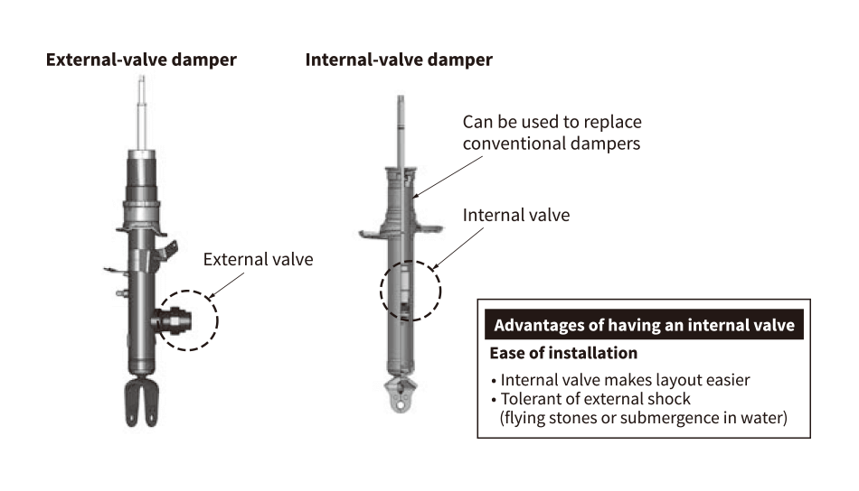 The damper with an internal valve has the same external dimensions as a conventional damper for easy replacement. An advantage of the valve being built-in is that it is more tolerant of external shock (flying stones or submergence in water).