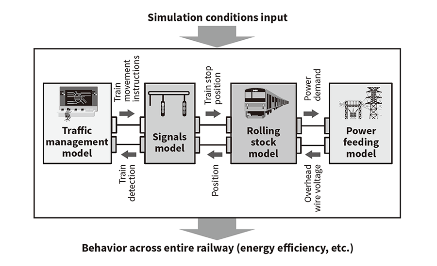 The simulator can simulate both traction and regenerative electric power for the rolling stock and supplied and regenerative electric power at the substations based on track conditions and operating conditions. Potential uses include planning for new substation construction or energy efficiency measures.