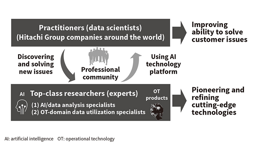 The professional community shares Hitachi's diverse portfolio of proprietary digital technology as use cases and practical expertise. Practitioners are engaging in mutual development while improving their data science skills. By bringing together the expertise of practitioners from a wide range of departments, and using it in human resource development and business innovation, these activities are helping to grow Hitachi's data utilization-driven OT and IT business areas.