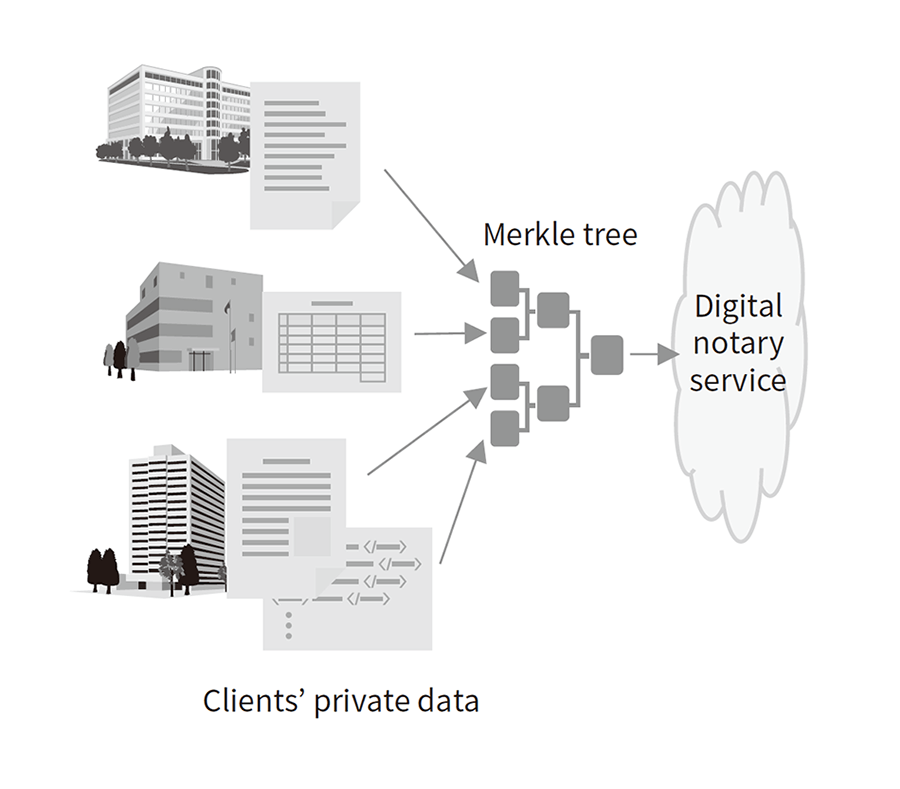 To mitigate this weakness of an internal blockchain solution, Hitachi has also developed the concept of a digital notary system that Hitachi or another third party would manage and control (see Figure 2). In this schema, the notary service holds copies of the hash proofs (also called a Merkle tree) but not the actual data. This ensures that private data never leaves the control of the company that created it. The integrity of the system and its data will never be in doubt because of this unique approach data certification.