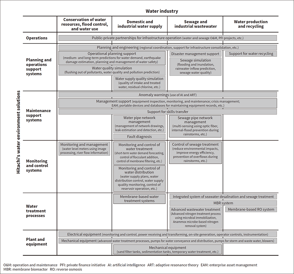 Hitachi is working on overcoming the water-related challenges in many different areas, including conservation of water resources, flood control, water use, domestic and industrial water supplies, sewage and industrial wastewater treatment, and water production and recycling. By promoting water environment solutions as well as individual products and services, the aim is to contribute to comprehensive solutions and system-wide optimization. Figure 1 lists the main technologies, products, systems, and services that underpin the solutions on offer, grouped by sector.