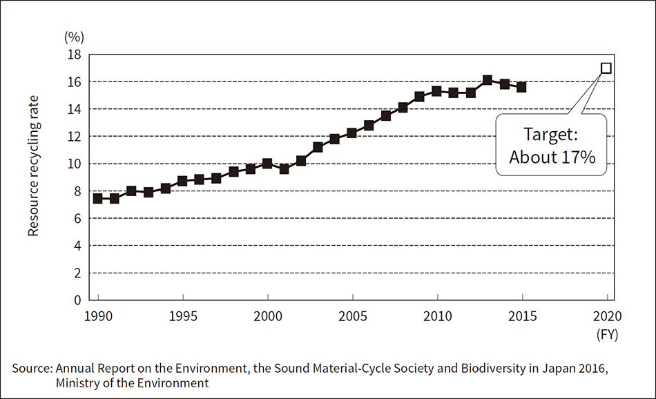 Japan’s recycling rate has risen fairly consistently, from 4.5% in FY1989, to 20.3% in FY2016.