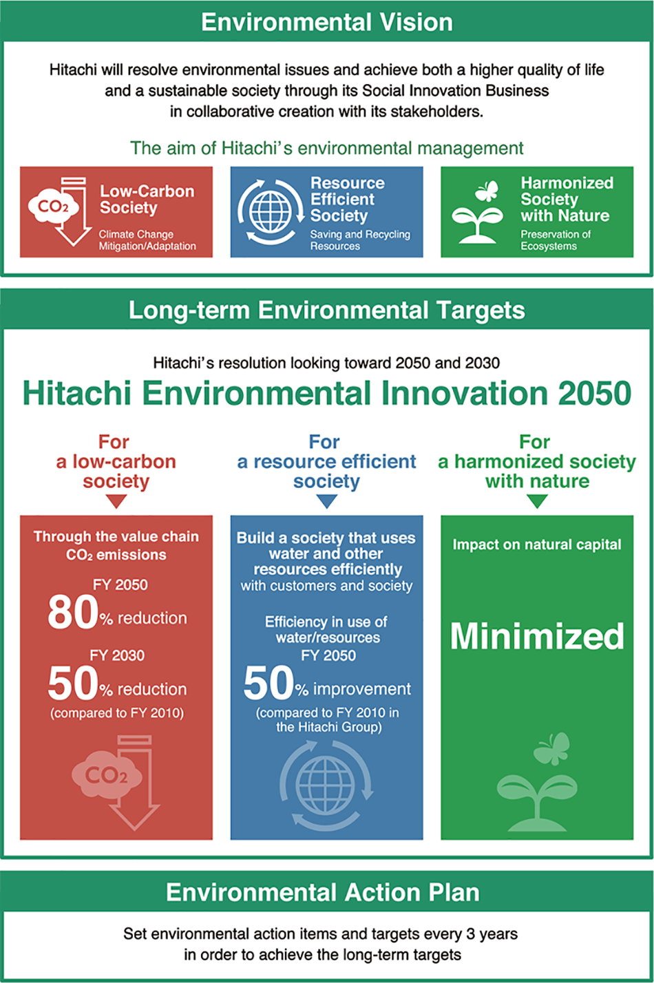 It was against this background that Hitachi in 2016 published its Environmental Vision for combining a sustainable society with an improved quality of life, expressing the stance we want to take on environmental business practices. We also formulated our Environmental Innovation 2050 long-term environmental targets that seek to achieve a low-carbon society, resource efficient society, and a harmonized society with nature. These targets included an 80% reduction in CO2 emissions through the company’s value chain by FY2050 compared with FY2010, a 50% improvement in the efficiency of the use of water and other resources by FY2050 compared with FY2010, and the minimization of our impact on natural capital. A feature of Hitachi’s approach is that, at a time when attention is being focused on climate change, the effects of which are becoming apparent in the form of global warming, it also places an emphasis on recycling and on coexistence with nature. Dealing with resource depletion and protecting biodiversity and ecosystems are issues that cannot be underestimated in the context of sustainability. The aim is to boost both business and societal sustainability by managing in a way that considers the environment from a broad perspective.