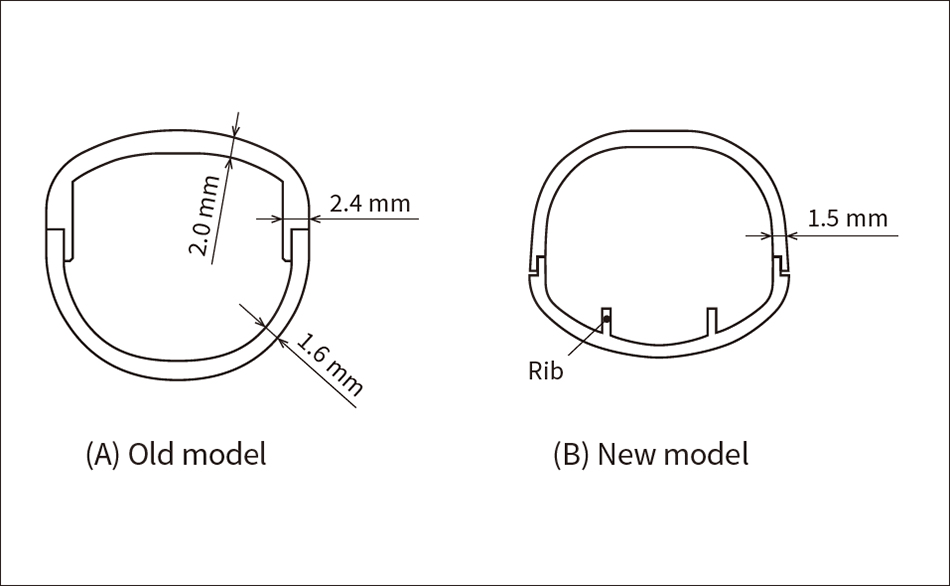 Another change was the use of thinner parts in the handle. Figure 7 shows cross sections of the old and new handles, both of which are made up of separate upper and lower pieces. Whereas the thicknesses on the old design were 2.0 mm and 1.6 mm respectively, the new design reduced both to 1.5 mm without compromising strength through the use of a more circular shape for the upper part and by adding a bare minimum of ribbing to the lower part.