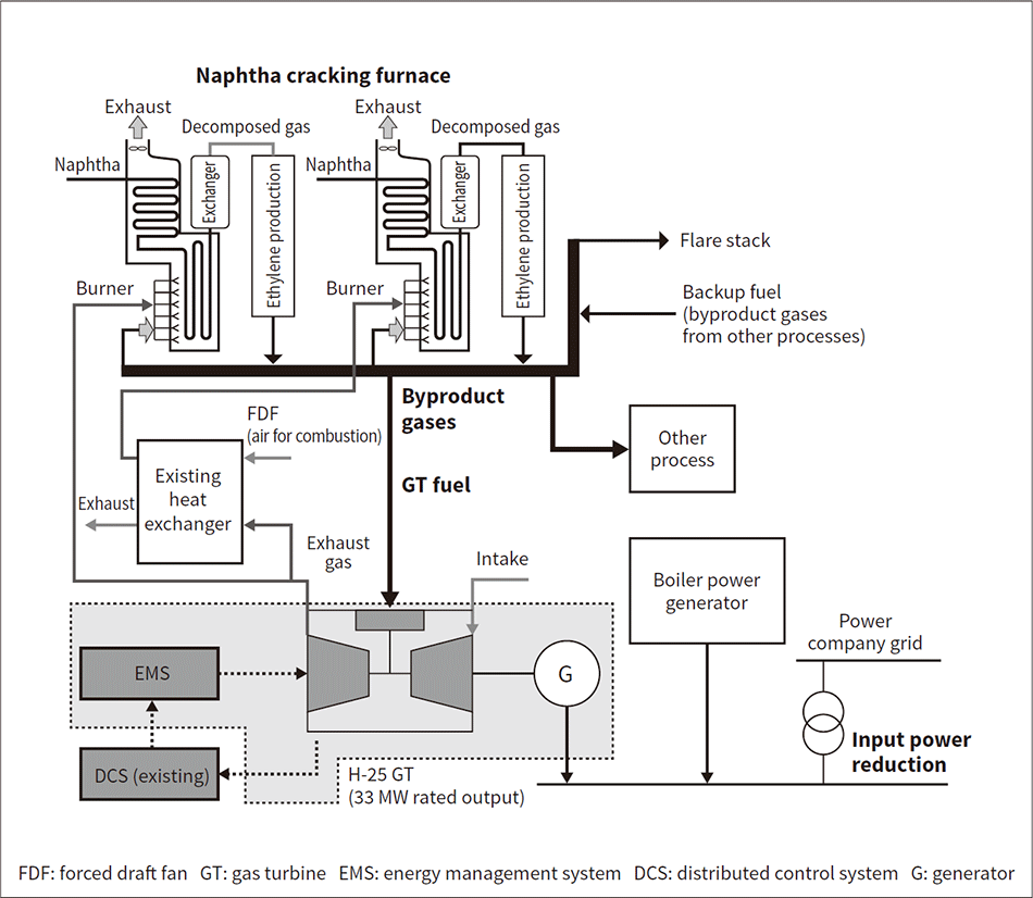 The ethylene production facility at Tosoh’s Yokkaichi Complex previously supplied the air needed for combustion to a naphtha cracking furnace through an existing forced draft fan (FDF). The new system supplied by Hitachi uses a heat exchanger to exchange the air for combustion with the heat of the GT exhaust gas. At the same time, GT exhaust gas is sent directly to another naphtha cracking furnace to achieve effective waste heat recovery.