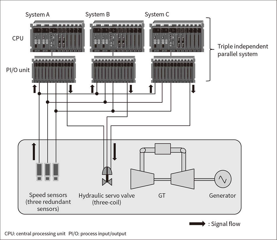 The GT control system uses a redundant configuration for components such as the central processing units (CPUs), process input/output (PI/O) units, speed sensors, and hydraulic servo valve (see Figure 4). It has a triple independent parallel system, and is designed to be more reliable at countering the loss of control or monitoring functions when a single component fails.