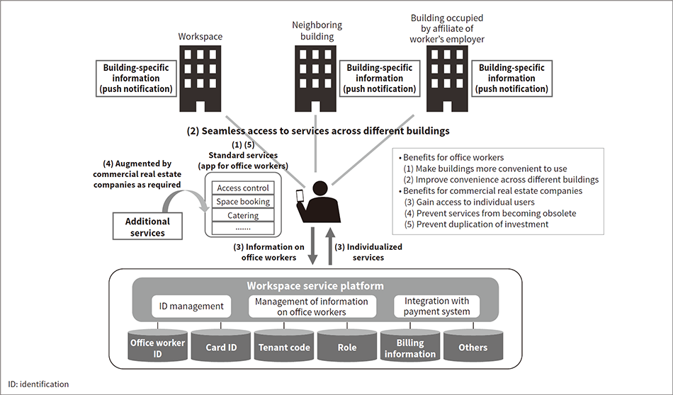As the major providers of office buildings, each commercial real estate company is seeking to go beyond their traditional role of providing fully equipped buildings (hardware) to also offer enhanced services (software). One example is how such companies have taken an interest in services tailored to the people who work in their buildings, including plans for services that seek to help individual office workers with convenience and productivity.