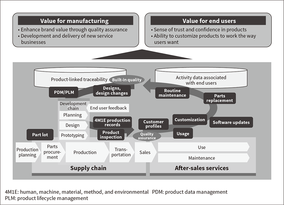 For manufacturers to go on providing safety and security to their customers, it is important that, along with ensuring the quality of their products, they also establish relationships of trust by means of those products. This article describes the technology and concepts behind comprehensive traceability that delivers new value to customers in the process of establishing this trust by linking products to data about events and workers as well as the products themselves. It also describes how traceability is used in practice in the automotive industry. Finally, the article discusses ideas about how traceability will be handled in the future across the entire lifecycle, from product development and prototyping to manufacturing, maintenance, and repair.