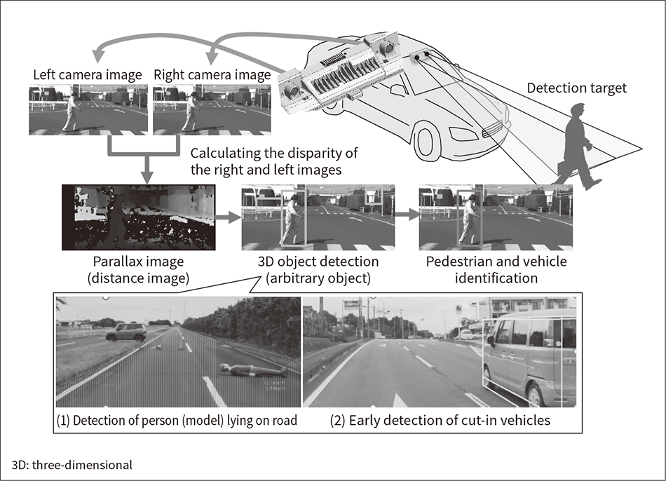 A feature of Hitachi’s stereo-cameras is that they use both stereoscopic vision and AI-based object identification processing to achieve sensing that has a low processing load and is robust against environmental changes. In stereoscopic vision, the object is captured in three dimensions by using two cameras to measure distance. Even objects with unknown shapes or patterns can be detected, making it possible to detect objects and measure distances even when the entire object is not visible. By utilizing this characteristic of stereoscopic vision, for example, as shown in (1) of Figure 2, even obstacles whose shape cannot be identified beforehand, such as a person lying on the road, can be detected without going through the process of prior learning that is required for monocular cameras. As another example, as shown in (2) of Figure 2, the shape and distance of a vehicle can be identified even in a situation where a vehicle that cuts in front of your car is not entirely visible. These features of Hitachi’s stereo-camera enables stable sensing functions even in complex driving environments.