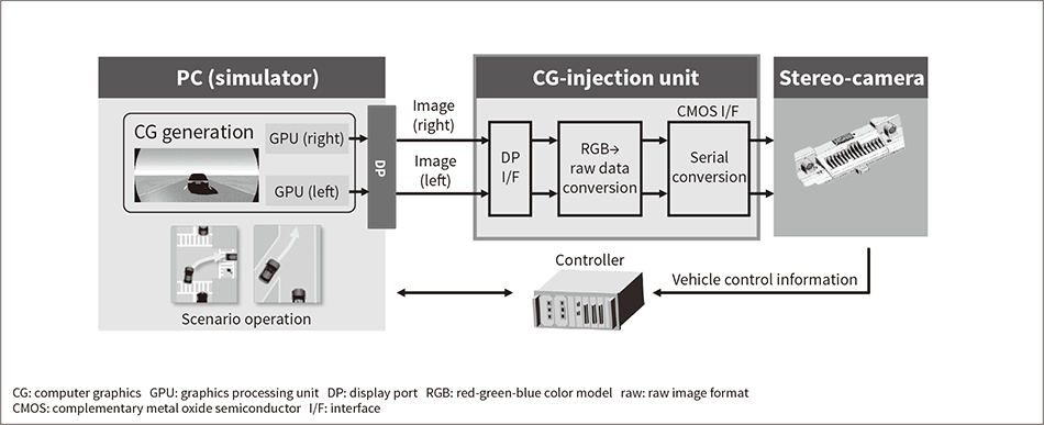 The HILS that was developed uses high-definition images created by computer in order to match improvements in image sensor performance, such as higher resolution. To simulate the high-definition images as image data obtained from the image sensor, Hitachi developed a CG-injection unit that processes the images and transfers them to the stereo-camera memory in real time. The developed HILS environment enables simulation of various traffic environments and verification of the sensing functions of the cameras.