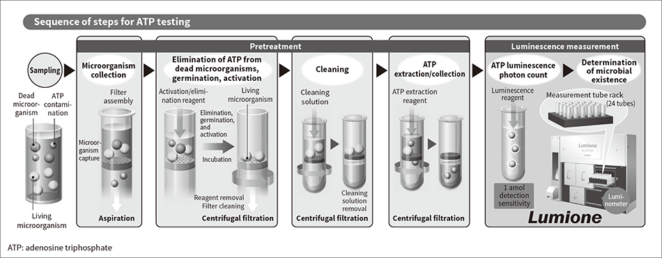Whereas the conventional visual testing method required 14 days of culturing, the ability of ATP testing to detect microbes with high sensitivity has shortened the testing time to between a few hours and one day.