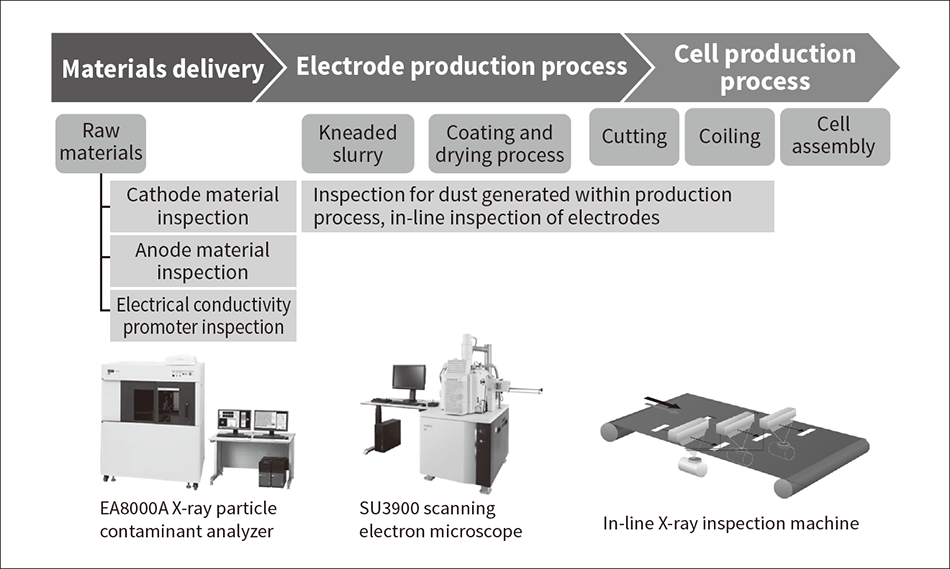LIB quality management requires dealing with metallic impurities from the acceptance inspection of material deliveries through to production process management. In response, Hitachi High-Tech has developed an X-ray particle contaminant analyzer and an in-line X-ray inspection machine that utilize X-ray techniques applicable to LIBs, as well as a scanning electron microscope (SEM) as the tools needed for the inspection and analysis of metallic impurities.