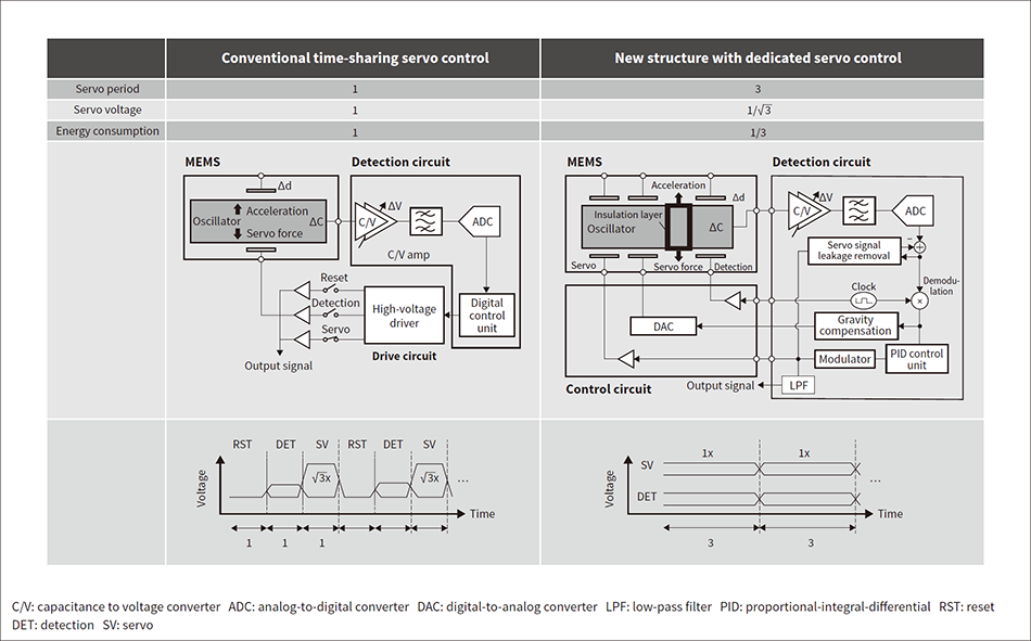 Figure 4 shows an overview of the ultra-sensitive vibration sensor using the newly developed MEMS structure. The sensor is comprised of three integrated circuits (ICs): the MEMS, control circuit IC, and detection circuit IC. When exposed to vibration, the MEMS weight moves and the distance to the electrode (Δd) changes, which changes the MEMS capacity value (ΔC). The vibration is measured by converting this capacity value change into a voltage signal (ΔV). Then, servo control is used to return the MEMS to the stationary state.