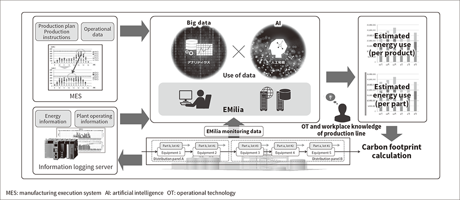 To meet these customer requirements, EMilia interconnects with external systems to link the time-series data it collects on energy consumption in production to the operational data held by the manufacturing execution system (MES) or other plant systems. By doing so, it is able to facilitate the calculation of carbon footprints by estimating how much energy is consumed on a per-product or per-part basis (see Figure 7).