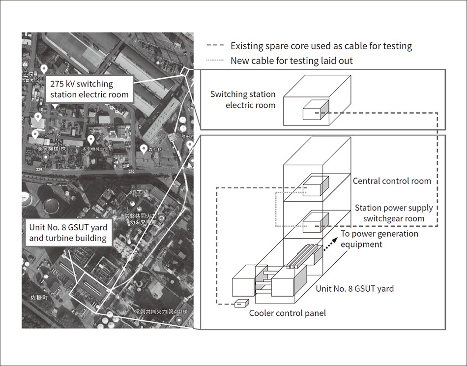 Measures to reduce the induced current were taken by constructing a detour circuit when disconnecting the lead wire between the existing transformer and the cable heads. The results of subsequent verification also confirmed the effect of reducing the induced current by limiting the output of unit No. 9. Therefore, when connecting the lead wire between the new transformer and the cable heads, in addition to constructing the detour circuit, Hitachi asked the customer to limit the output of unit No. 9, which further reduced the induced current and made the work safe.