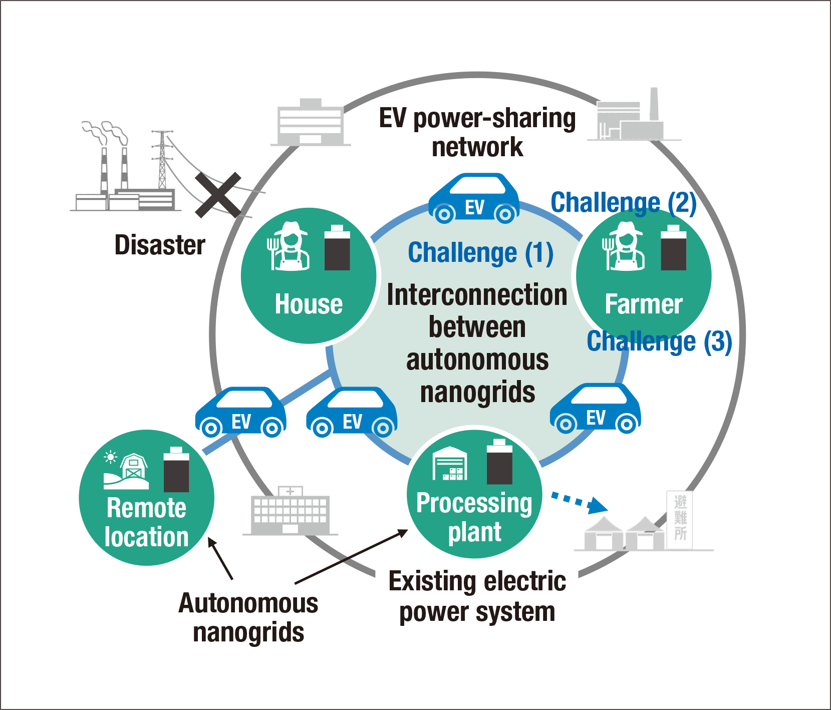 In response, Hitachi has been developing self-sustaining local energy systems based on local sourcing that will be small in scale and cheap to install as well as capable of operating on their own during disasters. The system is made up of community-level nanogrids that use EVs to share electric power with one another and provide more reliable operation of the electricity system and higher electricity revenue while also promoting regional revitalization and lower carbon emissions by local industry (see Figure 2).