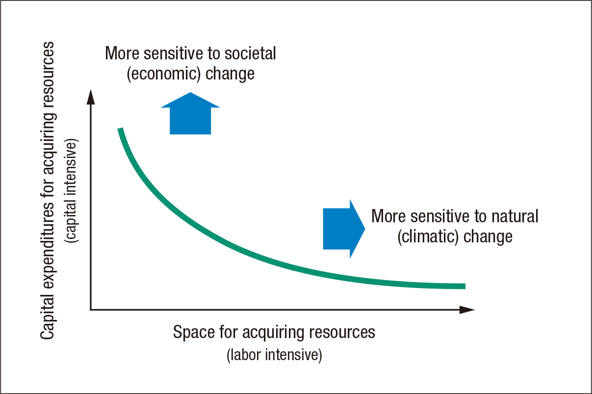 Generally, the more capital investment we pile onto the task of acquiring resources, the more sensitive we are to social (economic) change, while the more space we devote to resource acquisition, the more sensitive we are to natural (climatic) change (see Figure 3). Rather than everyone acting independently on global warming and other forms of climate change, it is important that we put measures in place that are founded on an integrated approach like this.
