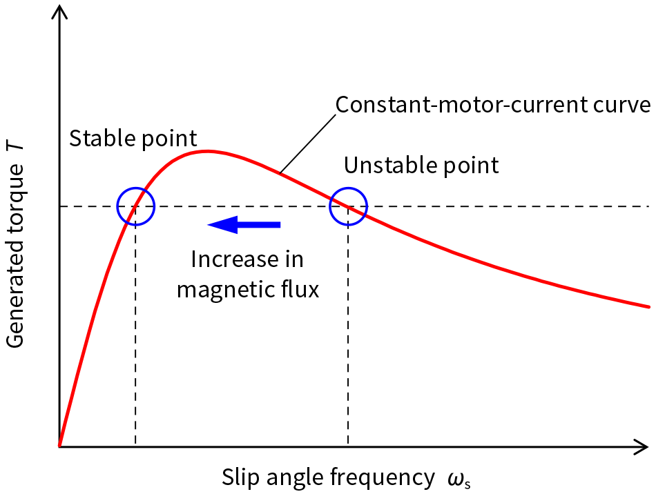 At the stable point, in contrast, an increase in slip angle frequency moves the operating point above the constant-torque curve, increasing the torque and acceleration and thereby reducing the error in rotor frequency estimation. That is, it acts in such a way as to drive the system back to the operating point.