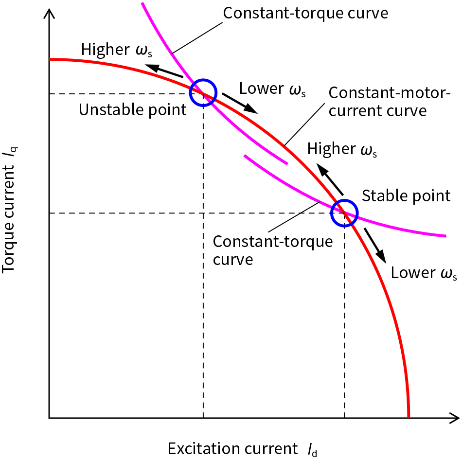 In Figure 3, the constant-motor-current curve follows a circular path and the constant-torque curves indicate the relationship between the excitation current and torque current that result in constant torque near each operation point. If magnetic saturation is ignored, the constant-torque curve is inversely proportional.
