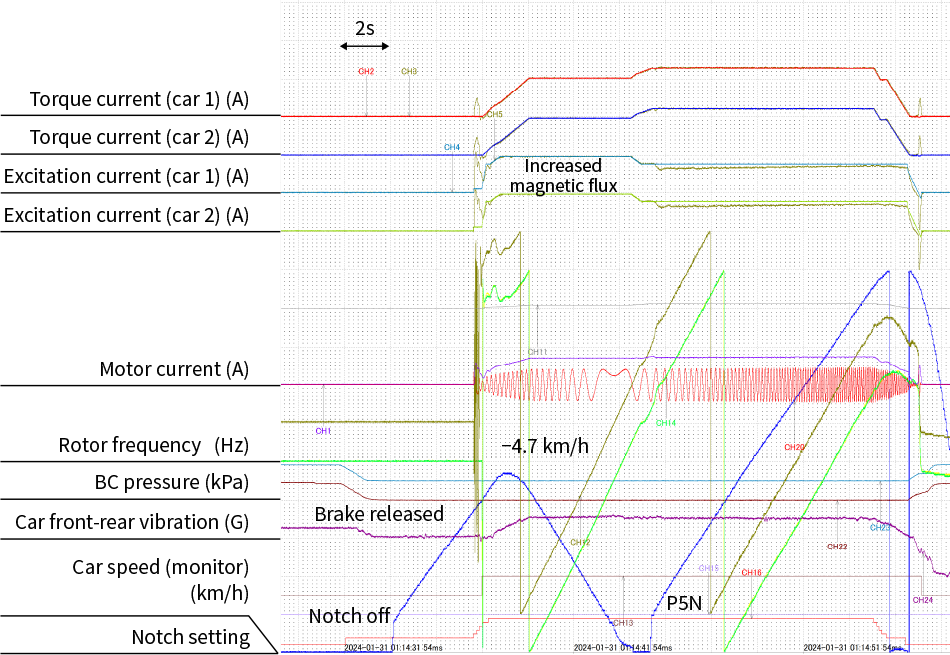 Traction and braking tests were conducted to verify that the traction performance and regenerative braking performance conformed to the design values. The results indicated good control of both traction and regenerative braking with no problems such as abnormal fluctuations in current or voltage.