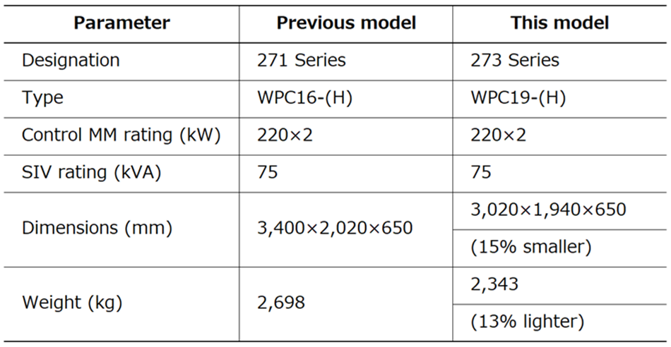Similarly, Table 1 shows a comparison with the train control system used in the existing 271 Series. The housing size has been reduced by 15% and the equipment weight by 13% while delivering the same VVVF and SIV capacities as before.