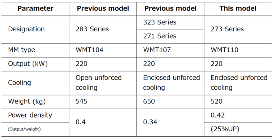 - Development of a traction motor small enough to be used with small-diameter 810-mm wheels. This was achieved by adopting a fully enclosed motor configuration with external fans and counter-flow cooling.