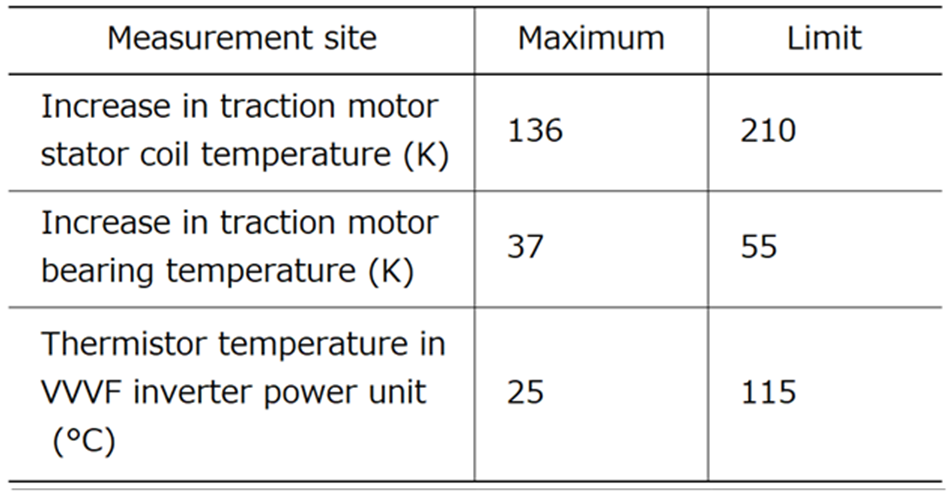Table 3 lists the test results. These show that the temperatures of both the VVVF inverter power unit and traction motors remained within the design limits.
