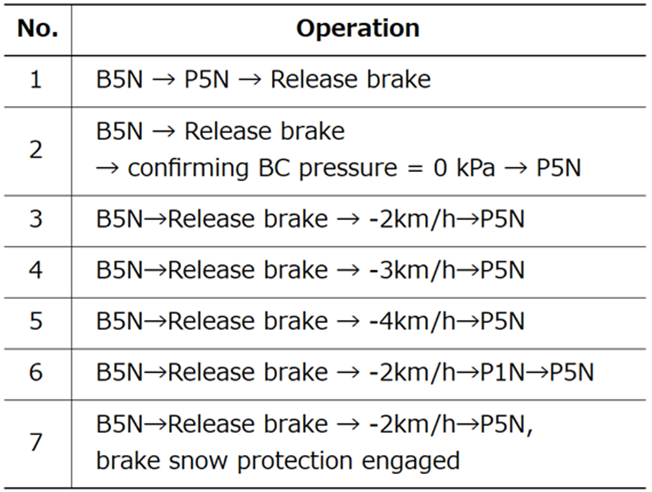 The graph shows the results of testing on a 25‰ incline using the sequence, B5N→release brake→-4 km/h→P5N.